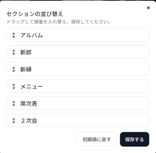 ページ内の「アルバム・新郎・新婦・メニュー・席次表・2次会」などのセクションは、ドラッグ&ドロップで順番を変更できます。